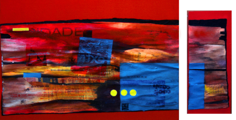 Nestes trabalhos, além das sacolas plásticas, eu utilizei pedaços de caixa de papelão, madeiras, jornais, telas plásticas, embalagens de remédios etc. A maioria sobre Duratex, produto (madeira) utilizado na embalagem de janelas de alumínio, que também é jogado na natureza. Gosto dessas embalagens, pois há algumas informações sobre a utilização do produto e gosto de aproveitar essas letras como parte da obra.